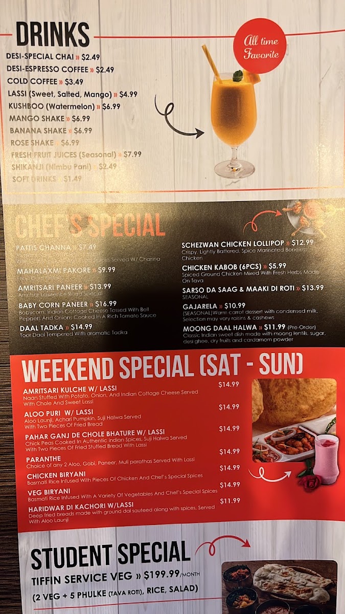 - Beverage Highlights: Quench your thirst with a chilled mango lassi or the Desi Special Chai, both highly recommended to enhance your meal experience.